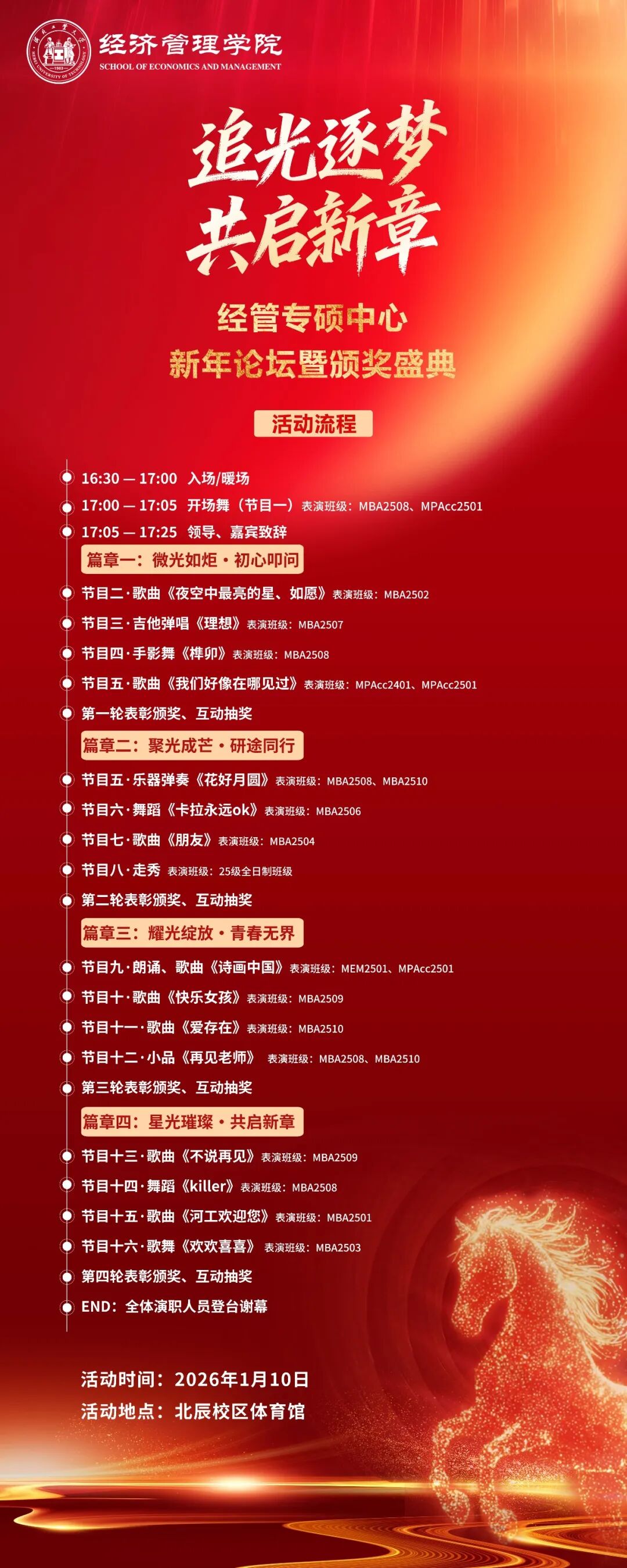 学生工作 新年论坛 | 剧透来啦,快来一起解锁~ 时间:2025-12-27 作者:访问量: 追光逐梦·共启新章 时光履新 暖意盈怀 经管专硕新年论坛暨颁奖盛典 期待与您相聚一堂 见证成长 共话未来 为了让大家提前了解活动内容 在此揭晓一些精彩亮点与关键信息 诚邀大家开启专硕中心的年度盛典 剧透一 欢迎校友回家 星河璀璨万象更新 那些曾迎着微光赶路的少年如今已身披锋芒 经管专硕盼你归家 惟愿你平安顺遂始终立于潮头之上 剧透二 一起祈福纳福 新年至福韵浓 手写福字承载暖意藏一份美好于心 现场送福字赠“红包”心愿墙寄语新岁 惟愿朝朝暮暮皆有福 岁岁年年皆欢喜 剧透三 加载连连好运 百份奖品已蓄势 速来拿下你的新年 “幸运签”开启整年好运气 惊喜随时在线希望永不打烊 剧透四 收获累累硕果 回顾2025 迎接2026 以青春为帆 驰骋山海 开拓万千可能 以理想为光 照亮前路 笃行奋斗之路 更多精彩,等待您的解锁 共庆新年,共享欢乐 经管专硕2026新年论坛暨颁奖盛典 1月10日,我们不见不散! 排版、校对| 随鲁琦 稿件审核| 尚舒 随鲁琦 责任编辑| 刘晓晶 分管审核| 马苓 审核发布| 赵钊 分享到: