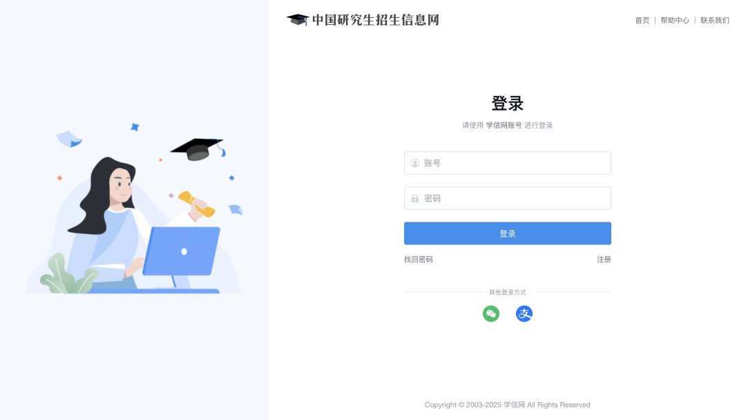 3. 登录中国研究生招生信息网,未注册过的同学必须先完成注册。您的登录账号和密码至关重要,后续的报名、打印准考证及查询成绩等所有关键操作均需在此平台完成,请务必牢记。