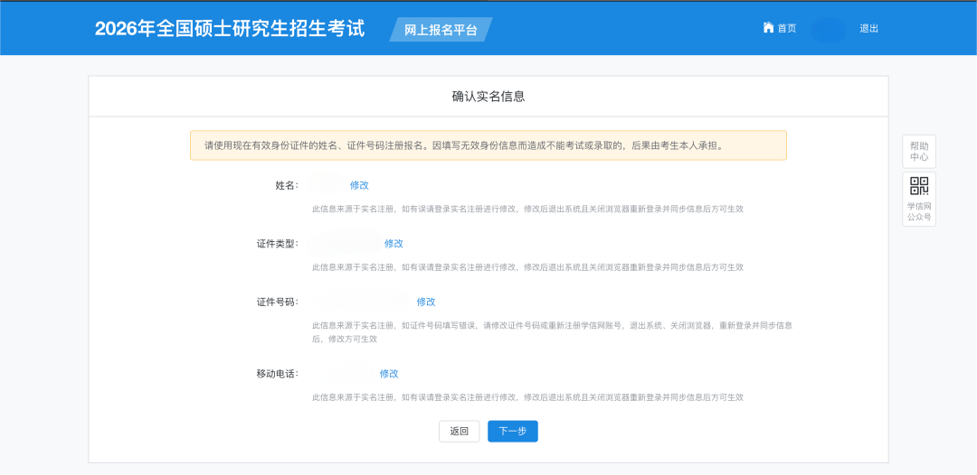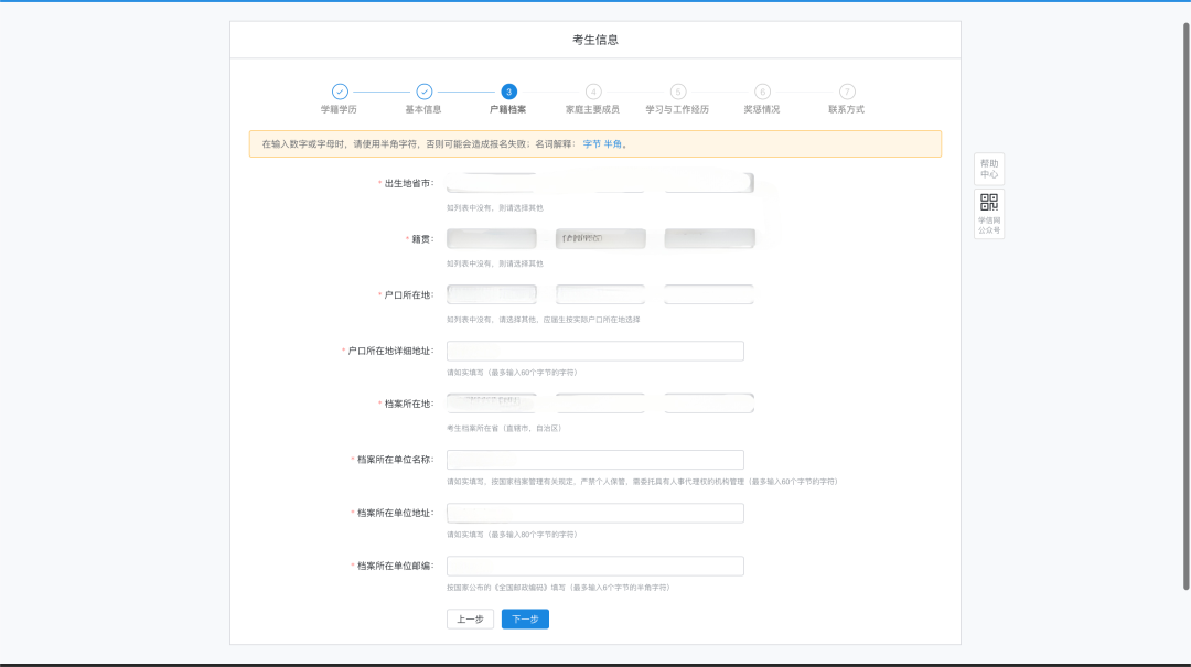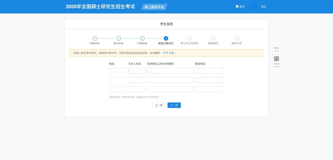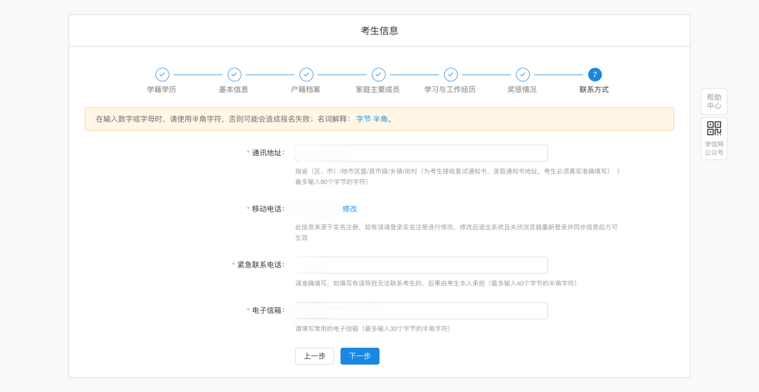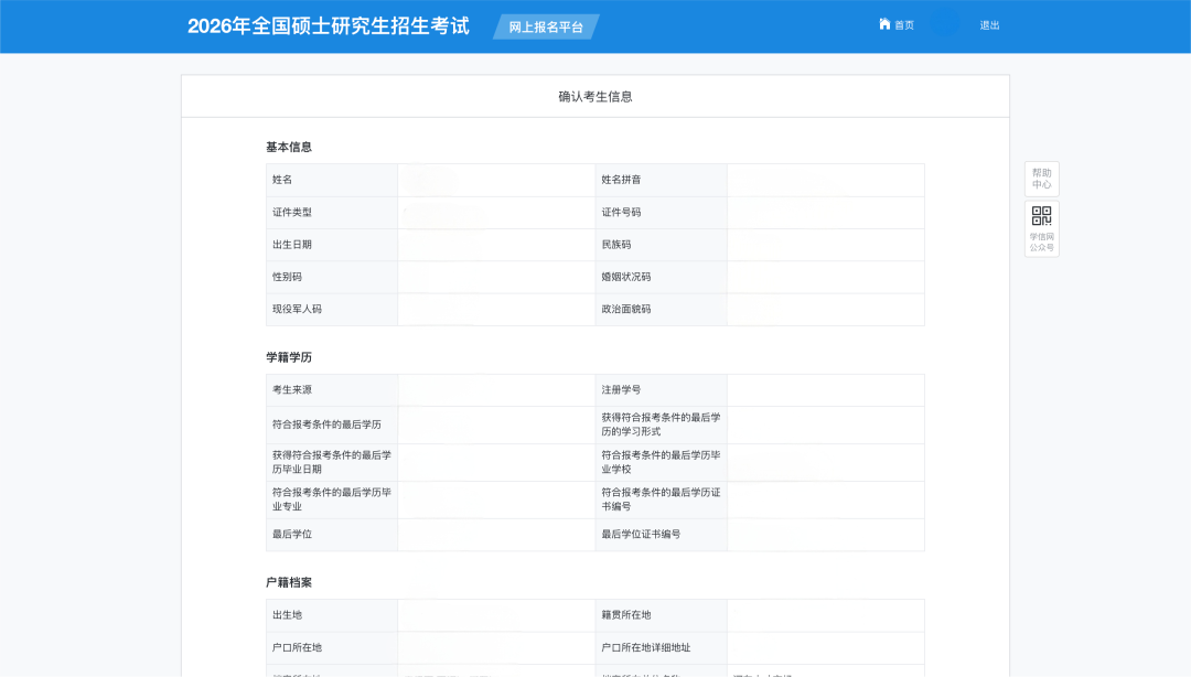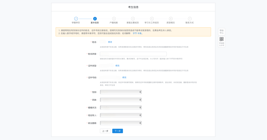 打开研招网,登录学信网账号后,需先确认实名信息(注意:这里同学们一定要仔细核对信息是否正确)。信息确认无误后,便可开始填写考生信息,主要包括:学籍学历、基本信息、户籍档案、家庭主要成员、学习与工作经历、奖惩情况、联系方式共七个部分。